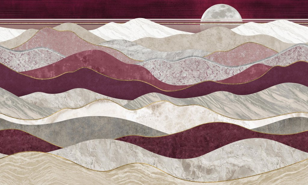 Merlot to abstrakcyjna kompozycję falistych linii i pasów w odcieniach burgundu, szarości, beżu oraz bieli, z delikatnymi złotymi akcentami, przywodząca na myśl krajobraz górski, z miękkimi liniami wzgórz i dolin. Każda z warstw ma unikalną teksturę, od szorstkich, kamiennych powierzchni po gładkie, marmurowe wykończenia, co sprawia, że Merlot ma jednocześnie harmonijny i dynamiczny charakter. Znakomicie sprawdzi się w nowoczesnym salonie, sypialni czy gabinecie. Ciepłe, ziemiste kolory i złote detale wprowadzą do wnętrza poczucie luksusu i wyrafinowania, idealnie komponując się z minimalistycznymi meblami i dodatkami w neutralnych barwach, takich jak biel, szarość i beż, podkreślając jednocześnie elegancję i styl pomieszczeniu.