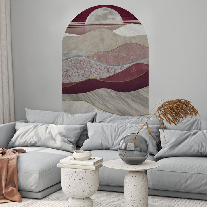 Merlot to abstrakcyjna kompozycję falistych linii i pasów w odcieniach burgundu, szarości, beżu oraz bieli, z delikatnymi złotymi akcentami, przywodząca na myśl krajobraz górski, z miękkimi liniami wzgórz i dolin. Każda z warstw ma unikalną teksturę, od szorstkich, kamiennych powierzchni po gładkie, marmurowe wykończenia, co sprawia, że Merlot ma jednocześnie harmonijny i dynamiczny charakter. Znakomicie sprawdzi się w nowoczesnym salonie, sypialni czy gabinecie. Ciepłe, ziemiste kolory i złote detale wprowadzą do wnętrza poczucie luksusu i wyrafinowania, idealnie komponując się z minimalistycznymi meblami i dodatkami w neutralnych barwach, takich jak biel, szarość i beż, podkreślając jednocześnie elegancję i styl pomieszczeniu.