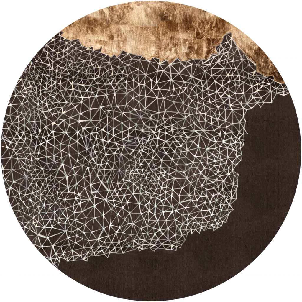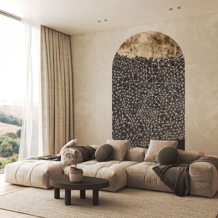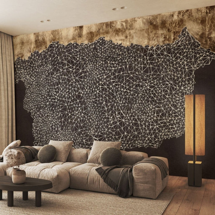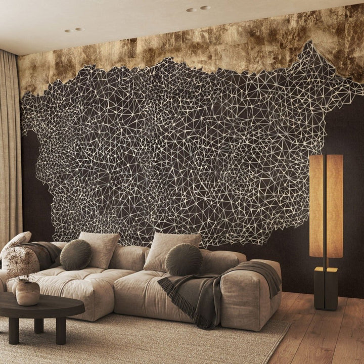 Mire przedstawia abstrakcyjną kompozycję z wyraźnym podziałem na dwie części- górnej, przypominającej fakturę starego, zużytego papieru lub zardzewiałej blachy oraz dolnej, w której domunująca jest głęboka czerń. Elementem łączącym jest gęsta sieć cienkich, białych linii, które tworzą skomplikowany wzór. Nowoczesny i geometryczny charakter Mire, w połączeniu z ciemnymi barwami i złotem daje efekt zmyslowego, trójwymiarowego muralu. To świetny wybór do współczesnych wnętrz, szczególnie tych urządzonych w stylu industrialnym lub minimalistycznym.