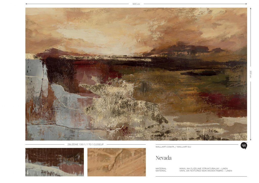 „Nevada” to subtelna, malarska kompozycja inspirowana spokojem rozległych krajobrazów i naturalną zmiennością światła. Fakturalne pociągnięcia pędzla tworzą wielowarstwową powierzchnię pełną miękkich przejść i organicznych struktur – od delikatnych, jasnych partii przypominających poranne mgły, po głębsze, ziemiste tony o ciepłym, melancholijnym charakterze. Wzór emanuje spokojem i poetycką atmosferą – jego powierzchnia przywodzi na myśl wyschnięte równiny, zachodzące słońce nad horyzontem i naturalne piękno przestrzeni nieujarzmionej przez człowieka.