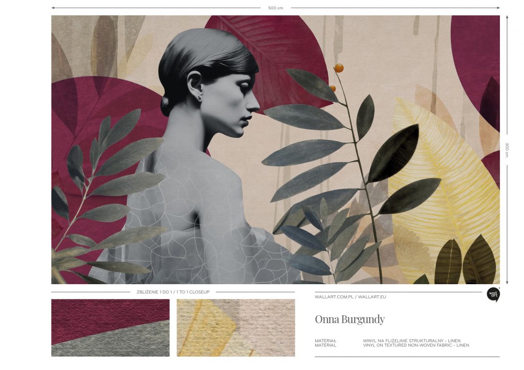 Onna Burgundy przedstawia subtelną, monochromatyczną sylwetkę kobiety otoczoną bujną roślinnością w odcieniach bordo, szarości i żółci. Tło jest stonowane, co sprawia, że centralna postać oraz rośliny wyróżniają się na pierwszym planie, tworząc harmonijną i elegancką kompozycję. Onna Burgundy doskonale nada się do wnętrz eleganckich i wyrafinowanych. Idealnie pasuje do salonu, gdzie może stanowić główny punkt dekoracyjny, przyciągając wzrok i dodając przestrzeni artystycznego charakteru. Wzór świetnie komponuje się z nowoczesnymi, minimalistycznymi aranżacjami, gdzie prostota form i kolorów jest kluczowa.