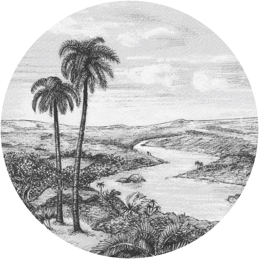 Palm to wizja oazy na libijskiej półpustyni. Krajobraz łączący w sobie bezkresny piasek, palmy oraz rzekę, dzięki szerokiej perspektywie optycznie powiększy wnętrze. Zastosowana technika rysunkowa sprawia, że pozornie zwyczajna tematyka obrazu, nabrała szlachetności i artyzmu.