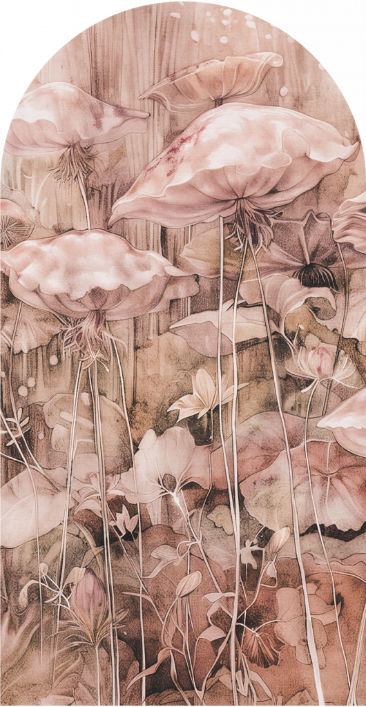 „Pandora Light” to subtelniejsza wersja kolorytyczna wzoru "Pandora", która przywołuje obraz porannego ogrodu skąpanego w miękkim świetle. Wzór przedstawia finezyjnie zilustrowane, niemal efemeryczne kwiaty – przypominające maki, lotosy i lilie wodne – otoczone miękko opadającymi liśćmi i wijącymi się łodygami. Wszystko to zostało uchwycone z niezwykłą precyzją i artystyczną wrażliwością, przypominając ręcznie malowaną ilustrację z botanicznego szkicownika. Kompozycja roślinna jest lekko przejrzysta – warstwowa, z subtelnymi prześwitami tła, które nadają wzorowi głębi i lekkości. Delikatne cieniowania i linearny kontur roślin wprowadzają dynamikę i wrażenie ruchu – jakby cała scena była zatrzymanym kadrem z rozświetlonego poranka w tajemniczym ogrodzie. Motyw jest harmonijny i spokojny, ale jednocześnie pełen życia – naturalny, lecz niebanalny. Wzór zachwyca dbałością o detale, balansując między akwarelową miękkością a graficzną precyzją.