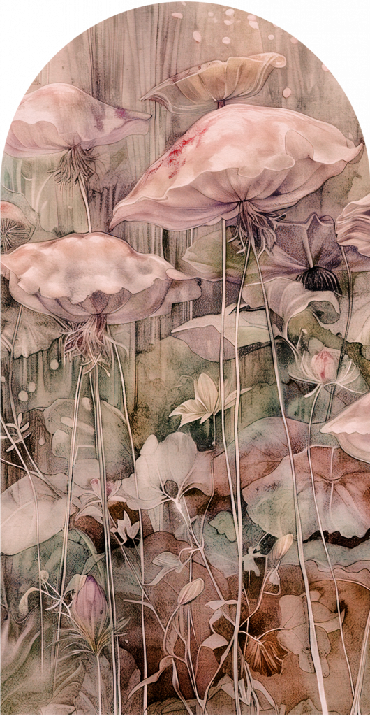 „Pandora" przywołuje obraz porannego ogrodu skąpanego w miękkim świetle. Wzór przedstawia finezyjnie zilustrowane, niemal efemeryczne kwiaty – przypominające maki, lotosy i lilie wodne – otoczone miękko opadającymi liśćmi i wijącymi się łodygami. Wszystko to zostało uchwycone z niezwykłą precyzją i artystyczną wrażliwością, przypominając ręcznie malowaną ilustrację z botanicznego szkicownika. Kompozycja roślinna jest lekko przejrzysta – warstwowa, z subtelnymi prześwitami tła, które nadają wzorowi głębi i lekkości. Delikatne cieniowania i linearny kontur roślin wprowadzają dynamikę i wrażenie ruchu – jakby cała scena była zatrzymanym kadrem z rozświetlonego poranka w tajemniczym ogrodzie. Motyw jest harmonijny i spokojny, ale jednocześnie pełen życia – naturalny, lecz niebanalny. Wzór zachwyca dbałością o detale, balansując między akwarelową miękkością a graficzną precyzją.