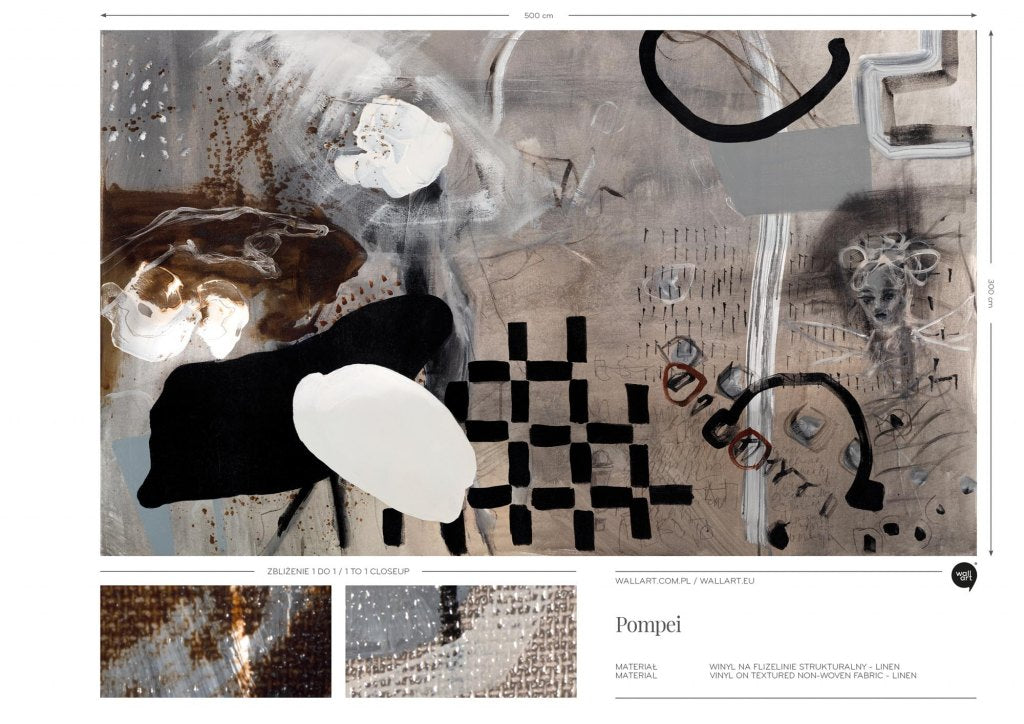 Pompei to abstrakcyjna kompozycja, łącząca w sobie różnorodne elementy, dzięki czemu tworzy złożone i wielowarstwowe dzieło. Tło obrazu utrzymane jest w neutralnych odcieniach szarości i beżu, z subtelnymi przejściami tonalnymi, którym dynamizmu dodają liczne, mniej lub bardziej niejednoznaczne motywy tworząc bardzo interesującą całość. Mnogość detali sprawia, że Pompei jest tajemnicze i pozostawia ogromne pole do interpretacji. Wielowarstwowość wzoru w połączeniu ze szczegółami, które przyciągają wzrok i zachęcają do bliższego przyjrzenia się, sprawiają, że Pompei dzięki swojej różnorodności, może być interesującym elementem dekoracyjnym w nowoczesnych wnętrzach, dodając im artystycznego wyrazu. Z kolei neutralna kolorystyka sprawia, że jest łatwy do wkomponowania w różne aranżacje.