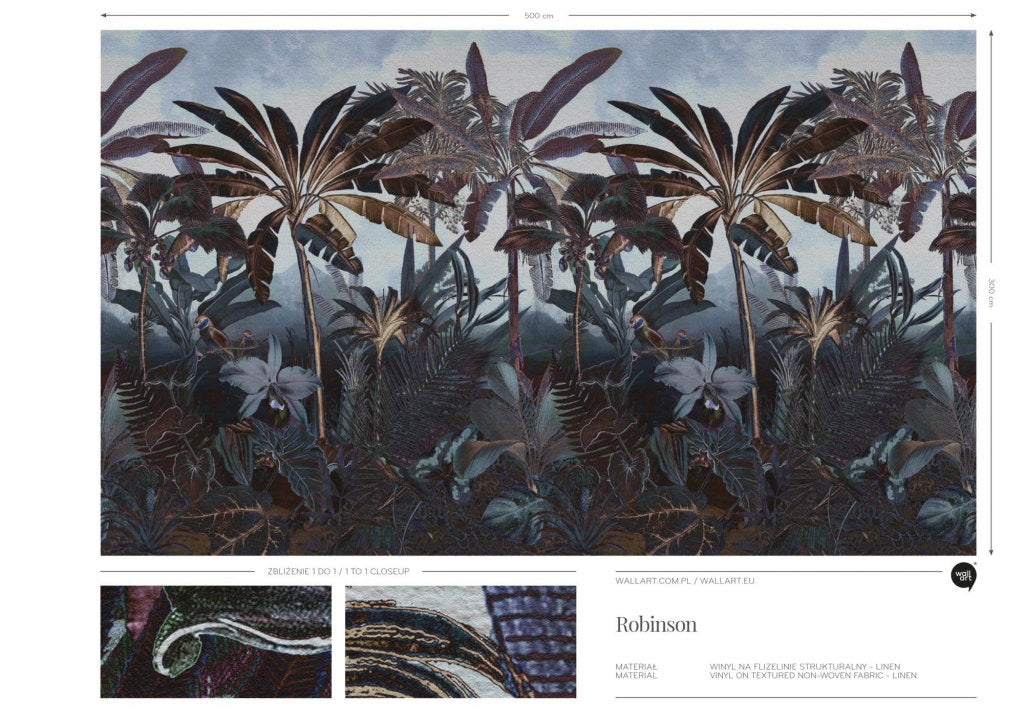 Robinson Crusoe to kultowa powieść podróżniczo-przygodowa opowiadająca o latach spędzonych na bezludnej wyspie. Zainspirowani historią Robinsona stworzyliśmy wzór jego imienia, nieco mroczny, tajemniczy, ale jednocześnie egzotyczny. Wysokie palmy optycznie podwyższą pomieszczenie, a niekonwencjonalna kolorystyka wzoru umożliwi skomponowanie go we wnętrzach, w których nie chcemy używać zieleni. Robinson to wzór, którego pierwszy plan jest mocny, przyciągający wzrok, który zyskuje lekkość poprzez drugi plan i widok zamglonych gór.