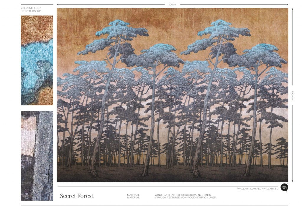 Secret Forest to wzór inspirowany sztuką, w kolekcji Nature. Tapeta przedstawia sosnowy las, w niespotykanej wersji kolorystycznej - brązu i niebieskiego. Wzór jest bardzo neutralny i elegancki. Będzie pasował do każdego pomieszczenia, a użytkownikom pozwoli się wyciszyć. Idealnie wkomponuje się w styl naturalny, skandynawski i boho.