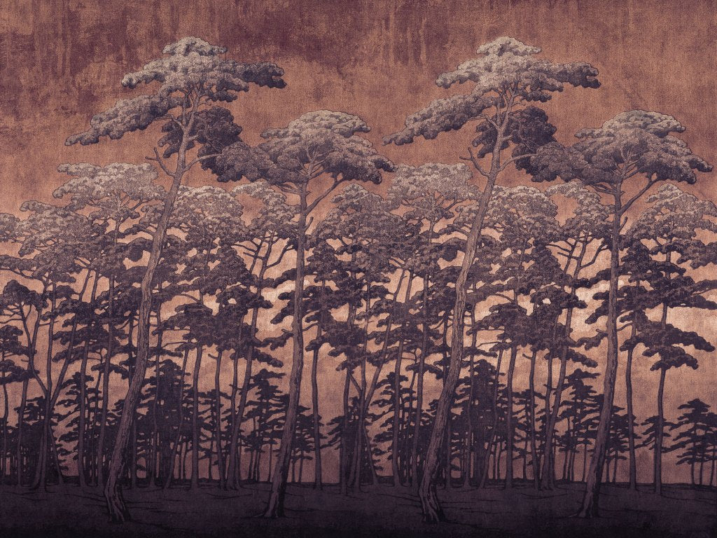 Secret Forest to wzór inspirowany sztuką, w kolekcji Nature. Tapeta przedstawia sosnowy las, o zachodzie słońca. Wzór jest bardzo neutralny i elegancki. Kolorystyka oberżyny, brązu i zgaszonego borda, będzie dobry tłem do jasnych mebli. Idealnie wkomponuje się w styl naturalny, skandynawski i boho, a także loftowy.