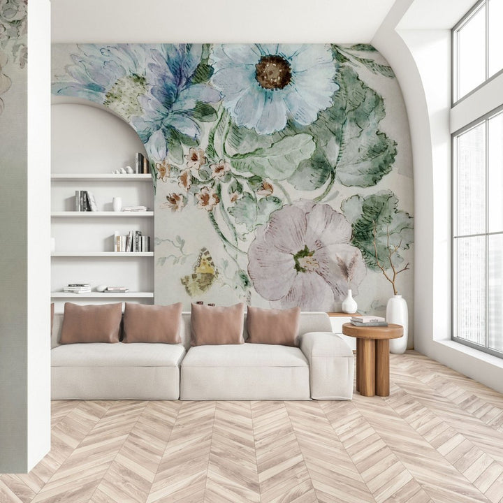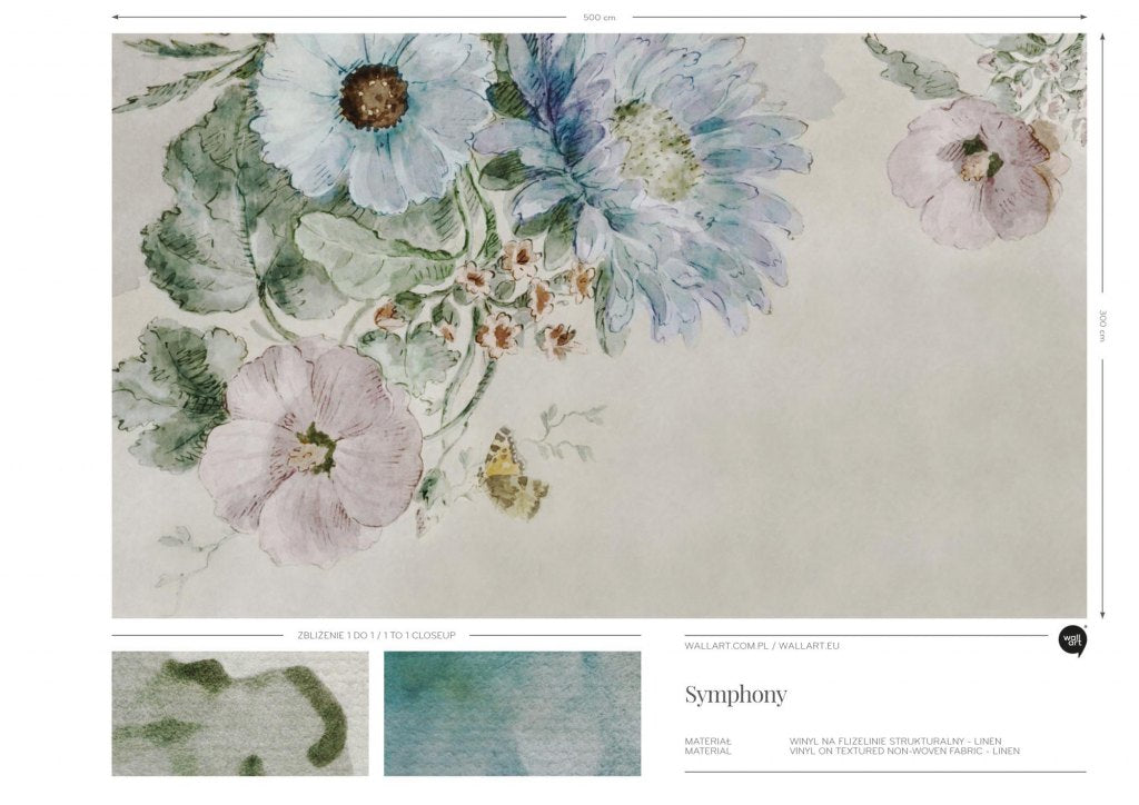 Symphony to siostrzany wzór bestselleru Harmony, z kolekcji Nature. Delikatne, malowane techniką akwareli kwiaty powoju, gerbery i nasturcji, w barwach błękitu, szałwii i pudrowego różu. Kwiatowa, eteryczna kompozycja nie przytłoczy pomieszczenia, a z pewnością będzie jego niebanalną ozdobą. Żaden miłośnik kwiatów, natury oraz romantycznych, prowansalskich wnętrz nie przejdzie obok wzoru obojętnie.