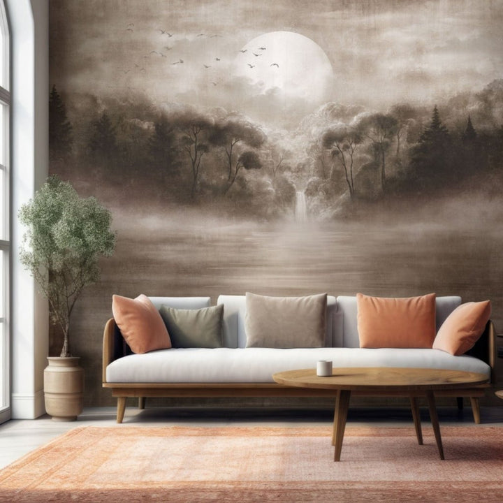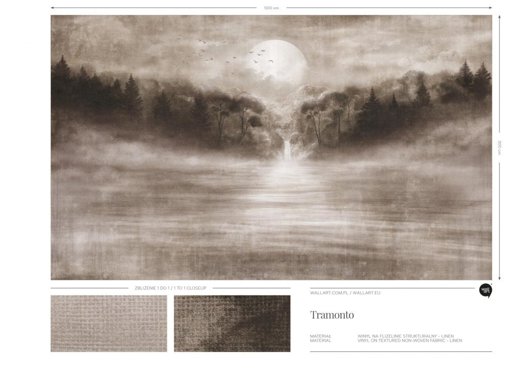 Tramonto to nieco tajemniczy krajobraz nocnego krajobrazu w dziewiczym lesie. Artystyczna wersja popularnego motywu wodospadu, przedstawiona w nieoczywistej, malarskiej formie dodaje Tamonto elegancji i pozwala zaaranżować w nowoczesnych wnętrzach. Księżyc i zachmurzone niebo odbijające się w zamglonej tafli jeziora daje poczucie ukojenia i rozprężenia. Ten nocny pejzaż będzie idealnym wyborem do sypialni czy salonu.